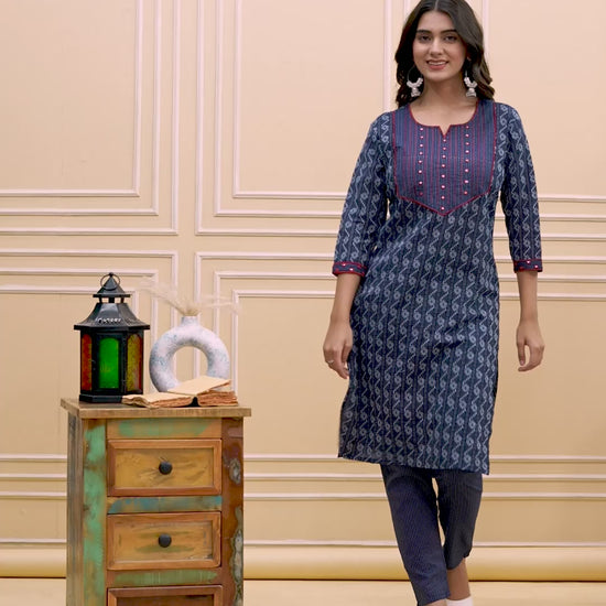 Elevate your everyday ethnic wardrobe with this navy blue ikat printed kurta pant set, crafted for women who love comfort wrapped in timeless elegance. The kurta features a beautiful all-over ikat pattern paired with striking red piping and button detailing on the yoke, giving it a refined and classy look.