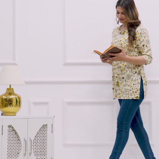 Women’s Cotton Printed Kurti – Stylish Beige Warli Art Design, 3/4th Sleeves, Casual & Office Wear Tunic Top