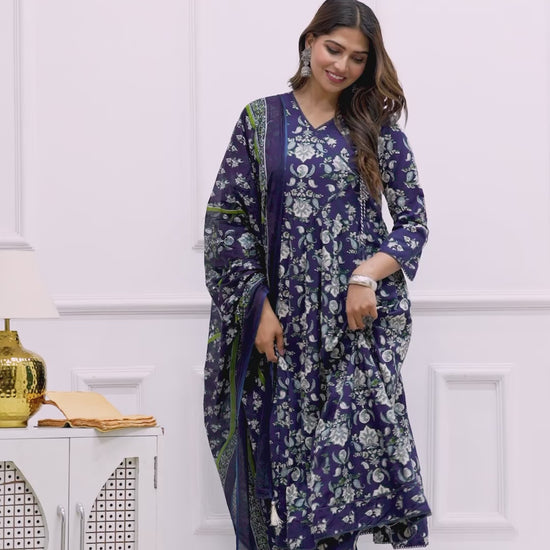 Step into timeless elegance with this Navy Blue Floral Printed 3-Piece Muslin Anarkali Kurta Set designed for every festive moment, family gathering, or special occasion. Tailored to perfection, this outfit combines comfort with effortless style.